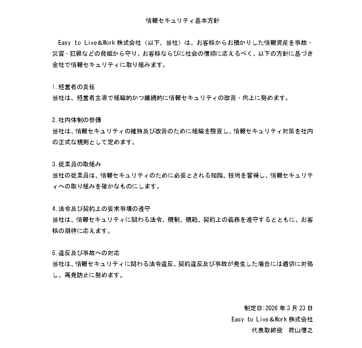 Easy to Live&Work株式会社は、独立行政法人情報処理推進機構(IPA)が運営する「SECURITY ACTION(セキュリティアクション)」の趣旨を理解し、2026年3月23日付で「SECURITY ACTION(二つ星)」を宣言いたしました。